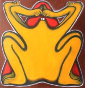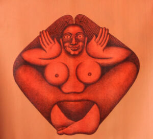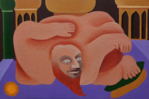 Shyam’s onerical imagination breaks onto the centre of the canvas and puts together a hermetically surreal
